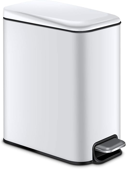 Stash your trash and keep the kitchen clean with this salt rectangular slim step trash can featuring a stay open and silent close lid a rubber band for bag tuck a removable inner bucket a non skid base and a durable fingerprint resistant finish.