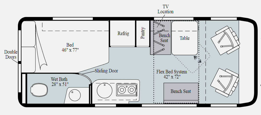 The adventurous spirit of the travato carries forward to the all new 59k with a re designed open floorplan featuring a space saving bath area and the deluxe froli sleep system.